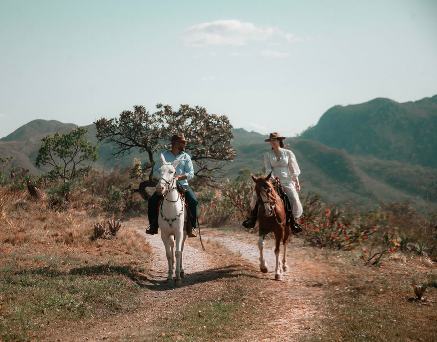 Em meio à natureza, o casal se conecta com olhares e gestos simples, mostrando o amor do dia a dia.